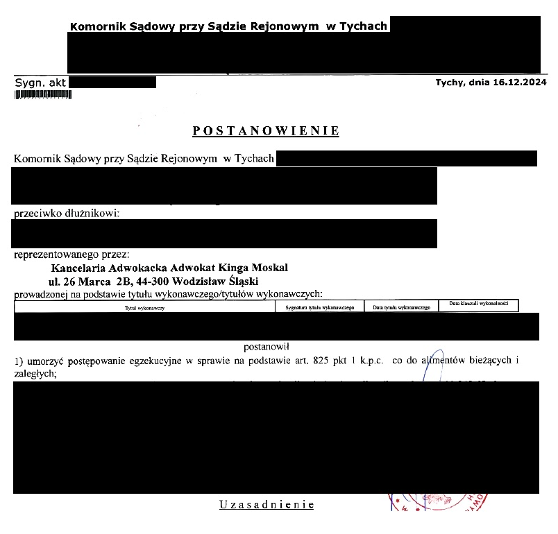 Dziś wracamy do sprawy egzekucji komorniczej dotyczącej alimentów – z satysfakcją informujemy o zakończeniu sprawy, która toczyła się przez ponad 8 lat i wymagała nie tylko determinacji, ale także wyczucia i skutecznych negocjacji. Dzięki działaniom Kancelarii, udało się doprowadzić do umorzenia egzekucji komorniczej, która przez lata ciążyła na Kliencie.